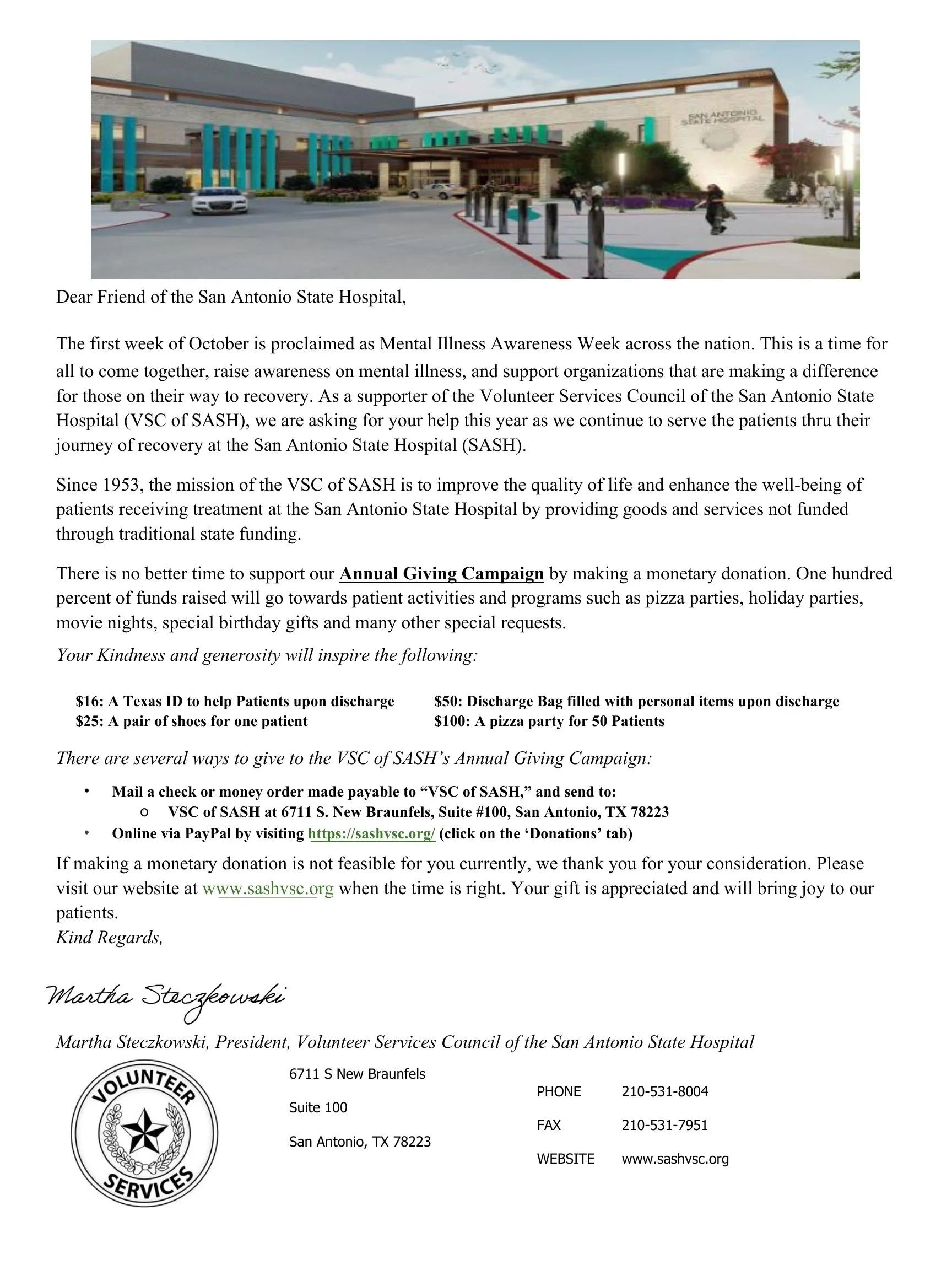 San Antonio State Hospital by providing goods and services not covered by traditional state funding.